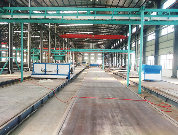 预应力长线台生产线由龙门布料机、预应力张拉放张系统、自动送料机、清理喷涂托筋机、自动振动机、覆膜拉毛一体机、生产平台、养护系统等设备组成。