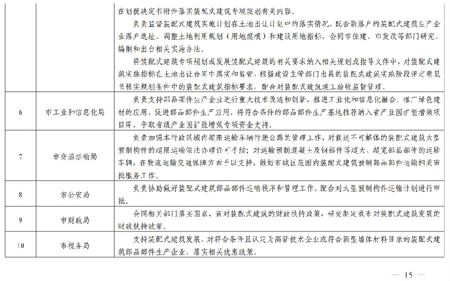 (二)加大督查力度。各县、区和各部门应高度重视装配式建筑的推进工作,参照本实施意见的工作职责,制定工作计划,明确本部门分工,并结合我市实际制定激励扶持政策,将装配式建筑推进工作纳入年度节能目标考核。