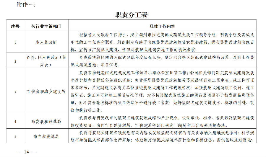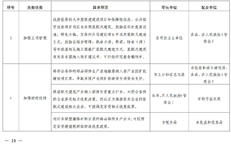 (一)强化组织领导。成立市推进装配式建筑发展工作领导小组,由市政府分管领导担任组长,市住建、发展改革、工业和信息化、自然资源、交通运输、公安、财政、税务、科技、生态环境、应急管理、市场监督管理等部门主要负责人为成员,成员单位要各司其职,密切协作、形成合力,共同推进全市装配式建筑发展工作。领导小组日常工作由市住房和城乡建设局承担。各成员单位要按照职责分工,制订具体配套措施和实施细则,密切协作配合,加大支持力度,扎实做好发展装配式建筑各项工作。各县、区政府(管委会)要建立健全工作机制,完善配套政策,组织具体实施,确保各项任务落到实处。(各部门具体任务分工详见附件一:职责分工表)