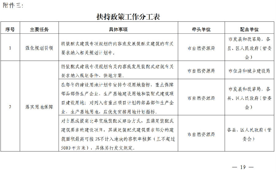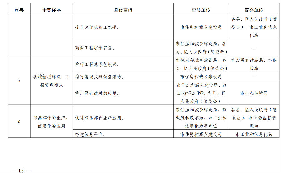 1.促进部品部件生产应用。按照“保证城市建设需要,总量控制,适度竞争,合理布局”的原则,科学指导装配式建筑部品部件生产基地规划建设,鼓励有条件的企业建设集科研、制造、示范和人才培养于一体的装配式建筑综合示范基地,扩大现有钢结构预制构件等生产规模,培育一批技术先进、专业配套、管理规范的骨干企业和生产基地,形成布局合理、管理有序、竞争公平的部品部件生产环境。