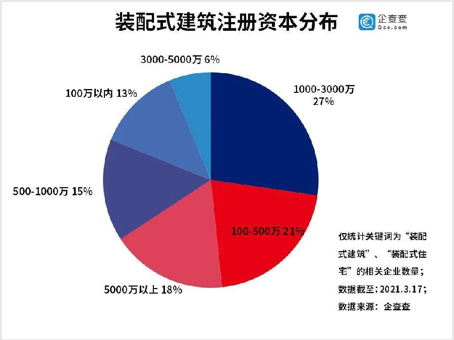 企查查数据显示,装配式企业中个体户数量较少,仅占2%。从注册资本来看,装配式建筑企业注册资本普遍较高,注册资本在1000-3000万元的装配式建筑企业最多,占27%,注册资本在100-500万元和5000万元以上的分别占21%和18%。