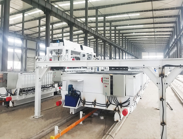 2.该设备采用双驱动行走减速电机,设备从注浆填充、主料、复合等一次性压制而成,设备自动化程度高,规格任意调整。产品表面平整,光滑,密实度高,真正实现了新型建筑墙体板材的工业化流水线生产。大大降低了生产工人的劳动强度,改变了以往的立模、平模浇注成型的诸多问题。