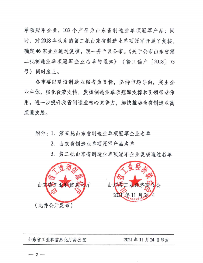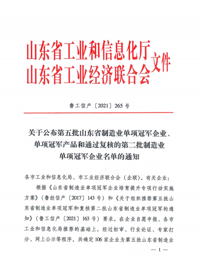 制造业单项冠军代表着我国细分行业非常高的发展水平、最强的市场实力。参评山东省单项冠军产品,企业必须满足长期专注并深耕于产业链某一环节或某一产品领域、从事相关领域10年及以上;产品市场占有率位居全国前五位且全省前两位;创新能力强,企业生产技术、工艺国际领先,重视研发投入,拥有核心自主知识产权,主导或参与制定相关领域技术标准;产品关键性能指标处于国内同类产品领先水平;企业申请产品能耗达到能耗限额标准先进值,安全生产水平达到行业先进水平。