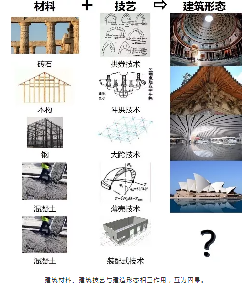 建筑历史上的形态演化,是对于材料和技艺革新的反应:建筑材料、建筑技艺与建造形态相互作用,互为因果,形成建构的逻辑线索,体现工具理性的价值观。新型装配式建筑作为一种新的建筑技艺,也必将影响着建筑外在形式的表达,形成具有工业化建造特色的建筑形态。