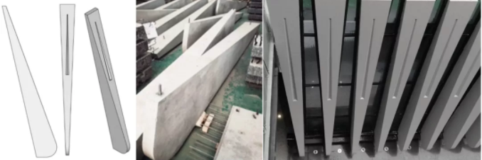 复杂造型的预制构件:西南院作品——成都城投远大生产基地办公楼,利用模具制造的三维异形外挂板构件。