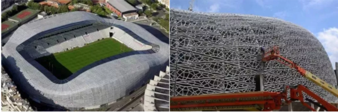 超大尺度的预制构件:国外优秀装配式建筑作品——由Rudy Ricciotti设计的吉博恩茵(鲍茵)体育场,采用2.4m宽,9m长的预制UHPC板块组合形成建筑的外表皮。