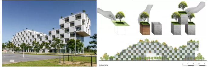 利用构件对装配式建筑形体进行塑造:国外优秀装配式建筑作品——由越南武重义建筑事务所设计的FPT大学理工大楼。将单体构件组成一个标准盒子单元之后,形成具备室内空间、阳台空间以及树池等复合功能的组合单元。再通过组合单元对建筑整体形体进行塑造,形成了具有特色的建筑形体。
