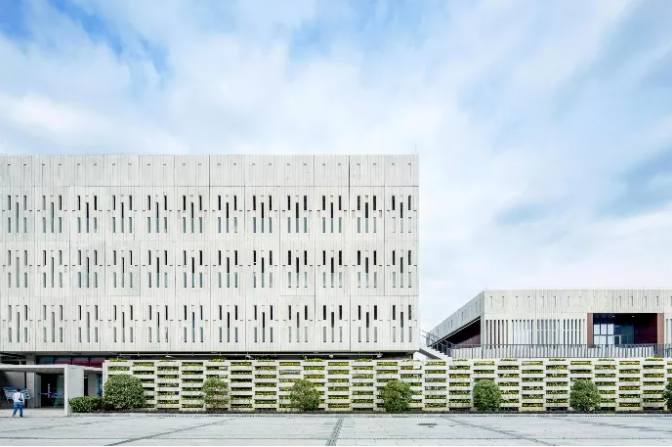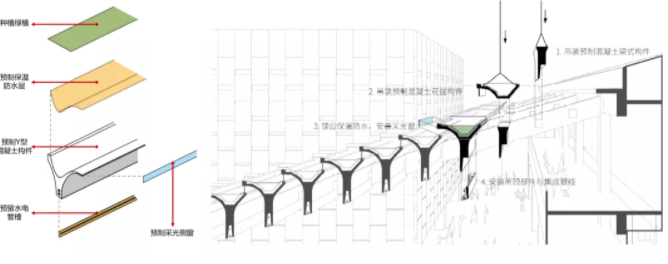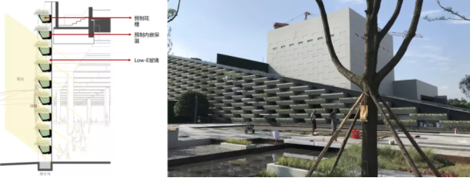 功能性构件的再设计:西南院作品——成都万科中西部展示中心项目,通过预制花槽构件形成的集成保温采光绿化功能的种植外墙。