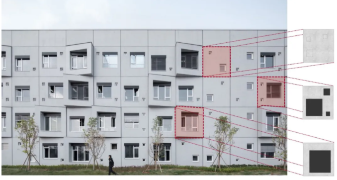 当采用同一类构件进行简单的堆叠时,难免会形成单一重复的建筑外立面。单一重复的建筑外立面固然可以使标准化程度极限化,从而大大提升生产、施工效率,但却会因过度标准化而丧失了建筑的个性。