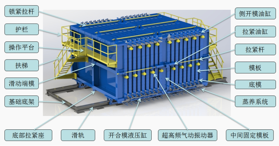 ► 研发了边模自动开合模系统,可实现成组立模边模自动开合,解决了动态配合精度及密封技术难点,满足构件高效、高质量生产。