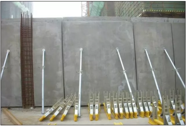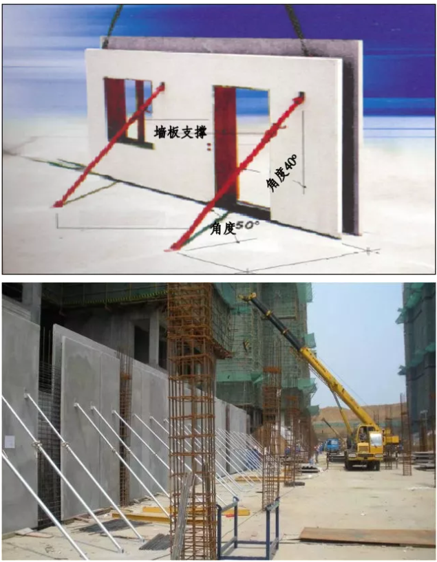 叠合墙板应按要求进行吊装,每块墙板用两根斜支撑固定和调整。叠合墙板吊装应按事先制定好的方案分段进行,尽量减少挪动吊车及工具。