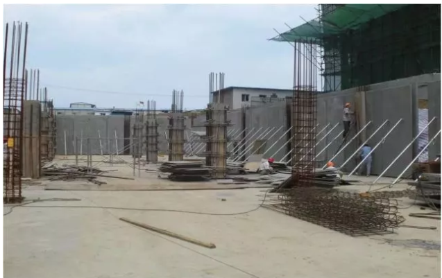 叠合墙板安装完成后,即可进行现浇框架柱施工,包括钢筋绑扎、支模、混凝土浇筑、拆模等。