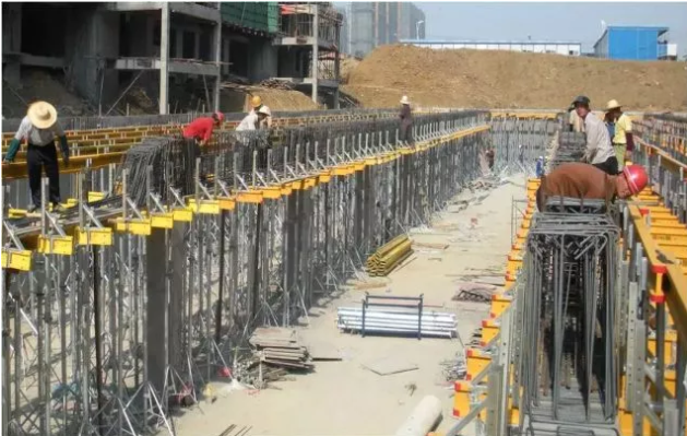 框架柱施工完毕后,开始进行现浇框架梁施工,包括支底模、绑钢筋、梁侧模加固等工作。