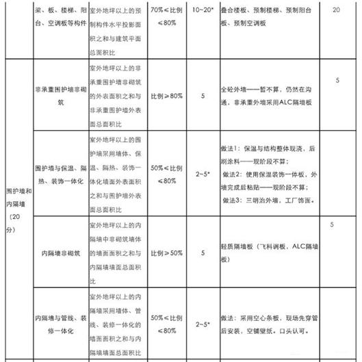 2、围护墙和内隔墙部分:围护墙采用ALC隔墙板,完成比例80%,得分5分;内隔墙采用ALC隔墙板,完成比例50%,得分5分;围护墙和内隔墙合计得分10分。