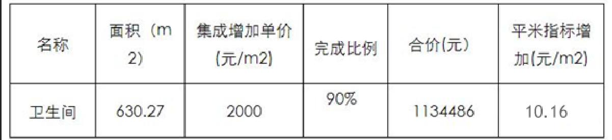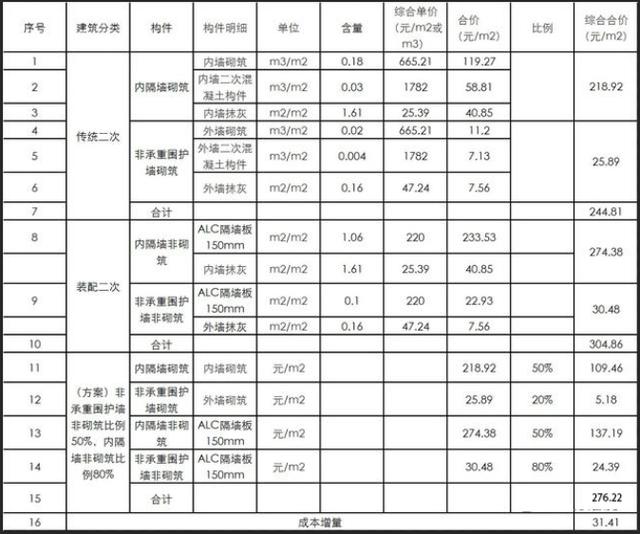装配式建筑二次结构成本增量预测表(含税)