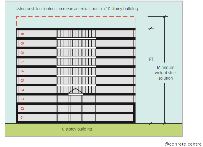 在不影响建筑总高度前提下,一般使用预应力混凝土每10层就可以增加一层。