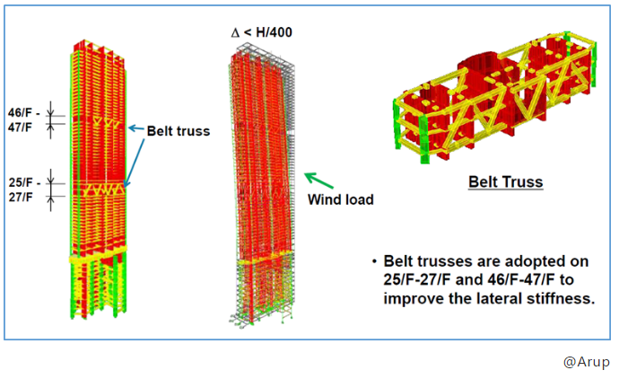 伸臂设置在低区,减少核心筒倾覆弯矩。采用额外两道腰桁架分别设置在25/F~27/F以及46/F~47/F,结构顶点位移1/408,满足1/400,顶点加速度为13.6mill-g,满足20mill-g最小舒适度要求。