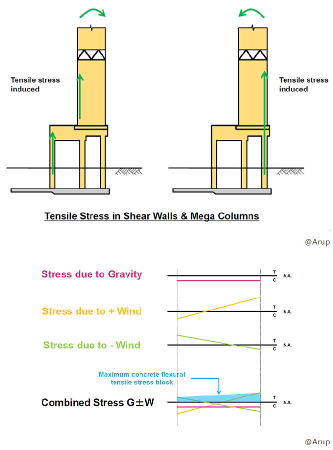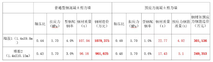 由于偏心和缺少竖向静载,核心筒墙的外侧将处于恒拉力状态。在风/小震下很容易超过ftk,同时中震下2ftk要求也很难满足,受拉剪力墙抗剪承载力目前计算研究还不充分,通常结构设计会采用增设钢骨,但是较高的配钢率即增加结构造价,施工也较麻烦。我们通过在外墙设置一定预应力钢筋,增加后张预应力来抵消拉力,减少或取消钢骨的含量,即确保偏心筒受力安全,经济上又具有一定优势。