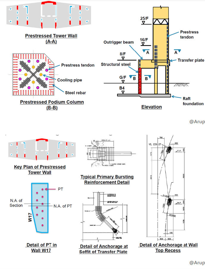 预应力结构在国内高层结构中应用相对较少,主要还是局限在楼板体系中有部分应用。本文结合奥雅纳部分高层结构在竖向构件、水平转换构件采用预应力结构的案例,谈谈预应力在高层结构应用拓展。主要内容节选自奥雅纳总工朱立刚的发言。