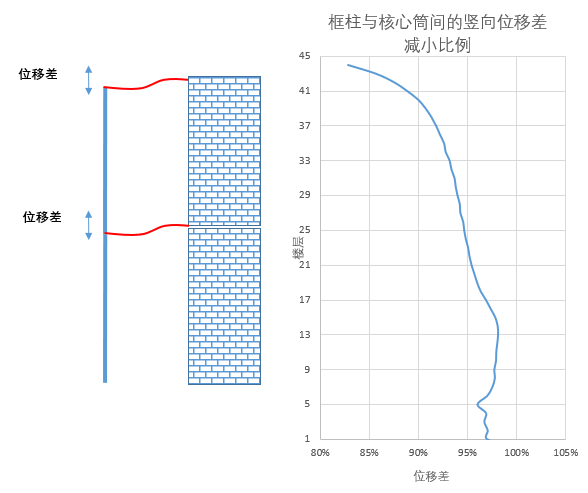 此外偏心筒由于筒体偏置,通常也会造成竖向荷载载荷差别,引起不同竖向构件间的较大位移差,会在水平构件间产生较大的附加内力。通过增加预应力后,能明显减少框架柱与核心筒之间位移差,楼层越高,减小的比例越大。