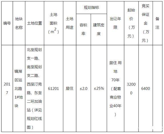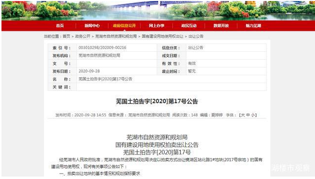 将于2020年10月16日以拍卖方式出让镜湖区站北路1#地块(2017号宗地)的国有建设用地使用权,目前正在公示招拍中。