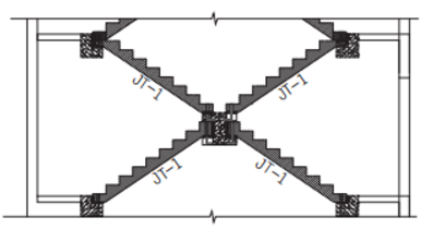 2.在剪刀楼梯立面中间设计1道梯梁,将楼梯一分为二。如图1剪刀楼梯拆分示意图,中间增设的Z字形梯梁可以作为楼梯搭接,也可以代替楼梯的1个踏步高。值得注意的是,这个 拆分后的预制楼梯高端平台和低端平台的高度会不一致,中间的Z字形梁是1个左右不同且分层的异形构件,需要现场支模现浇。