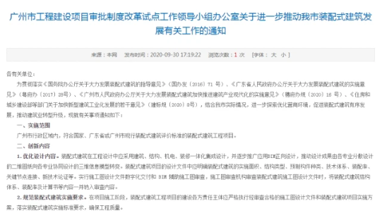 日前,广州市工程建设项目审批制度改革试点工作领导小组办公室发布《关于进一步推动我市装配式建筑发展有关工作的通知》,提出在装配式建筑中全面推行全装修。