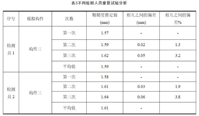 由上表可知,检测员1的三次数据之间的误差最/大为0.05mm,检测员2的三次数据之间的误差最/大为0.06mm,两个检测员对同一构件检测的平均值分别为1.59mm和1.61mm,具体分析见下表3不同检测人员重复试验分析:(PC固定模台生产线)