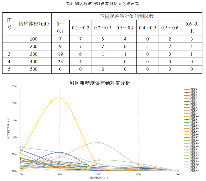 通过试验分析,对28个测区中100 mL 、200 mL 、300 mL 、400mL的数据与500mL体积数据进行比较,发现当铺砂量为100 mL 时,50%的数据偏差在0.2mm以上,当铺砂量为200 mL 时,43%的数据偏差在0.2mm以上,当铺砂量为300 mL、400mL和500 mL时,粗糙度推定値的数据已基本达到稳定,90%的测区数据偏差在0.2mm以内。(PC固定模台生产线)