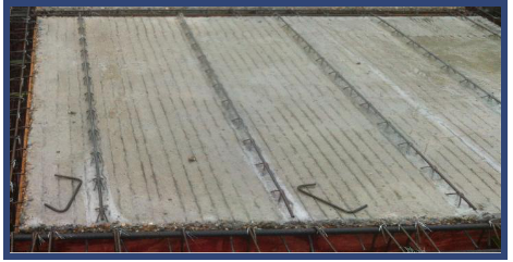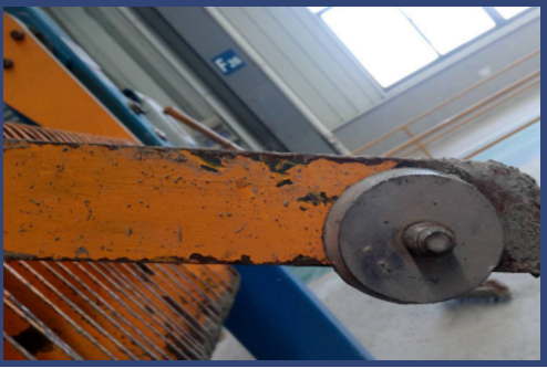 通过我们在实验过程中总结的经验,首块板拉毛时,要根据生产的混凝土坍落度及拉毛的深度,微调拉毛系统的高度,使大部分刀片满足拉毛深度的要求,对于部分构件拉毛深度仍不够的情况下,可通过部分深度不够的刀头增加负重的方式改善拉毛(图片仅为示意),见图3.7。这样的好处是可以避免拉毛深度过大而增加断板的机率。(PC固定模台生产线)