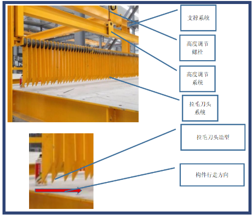 设备主要包含支撑系统、高度调节系统、拉毛刀头系统。见图3.3拉毛设备实物。(PC固定模台生产线)