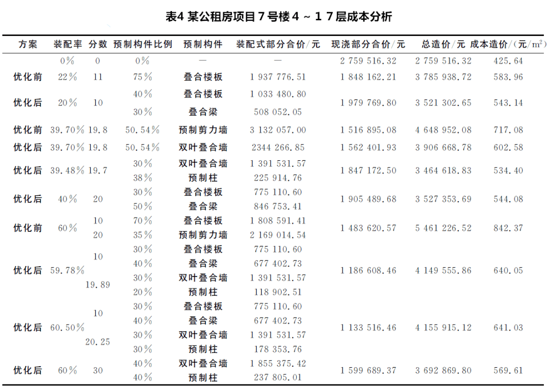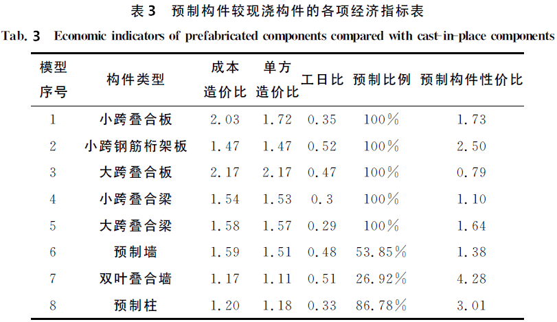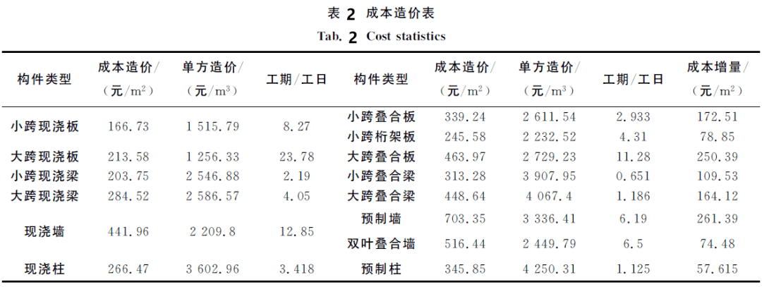 造成上述现象主要是由于预制楼板虽然工期提前36%~46%,但因板体积较大,从生产工厂运到施工现场时的费用增高,同时传统塔吊等机械无法满足叠合板的组装,大型机械的个性化需求使机械费用有所增加。在组装过程中,楼板接缝的处理费用会更大,而叠合梁、预制柱在预制工厂内生产,其规格标准较为统一,现场吊装精准度提升,带来的工期效益约为12元/㎡,造价效果较明显。综合考虑成本增量、预制构件性价比、工日比等经济指标,得出以下结论: