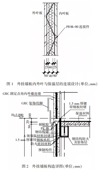 构造设计为60 mm外叶板+40 mmXPS保温层+60 mm内叶板,见图1。内、外叶板与夹心保温板之间通过PDM-90连接件连接。墙板外侧采用GRC装饰线脚实现建筑外立面线条造型设计效果。上下墙板拼缝防水采用材料防水为主、构造防水为辅的防水方案,在墙板接缝处设置企口坡度,并在企口两端用PE棒封堵,企口接缝外侧用耐候胶处理,防止水汽进入板缝向室内流动渗透,墙板上下拼缝内侧用A级保温材料封堵,保温材料上下端采用1.5 mm厚镀锌钢板封堵,防止水汽进入腐蚀钢结构主体。海天机电轻质墙板生产线,墙板设备,隔墙板设备,复合墙板设备,陶粒墙板设备,石膏墙板设备,发泡水泥墙板设备。