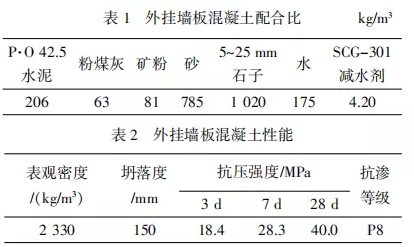 外挂墙板内外叶混凝土板强度等级为C30,为保证外挂墙板质量,首件制作时对同配合比混凝土进行力学性能、工作性及耐久性能试验,试验配合比及试验结果见表1、表2。