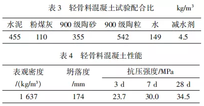 由于普通混凝土表观密度较大,生产的构件自重大,生产脱模、吊装运输、现场安装的成本和难度也随之增加,加之外墙挂板属于非承重的外围护结构,不承担主体结构的荷载,对安装节点的设计方面也会增加难度。因此,针对大面积外墙挂板,为了减轻其自重,缓解运输和安装的压力,本文根据JGJ 51—2002《轻骨料混凝土技术规程》规定,通过试验研究,设计了密度1 600级,强度等级LC30的轻骨料混凝土,其配合比及试验结果见表3、表4。为保证轻骨料混凝土构件表面光洁平整,在振捣过程可采用插入式振动器振捣混凝土时,其插入的距离以30 cm为宜,混凝土应振到停止下沉,无显著气泡上升,表面平坦一致,呈现薄层水泥浆为止,不得过振以避免轻骨料上浮。
