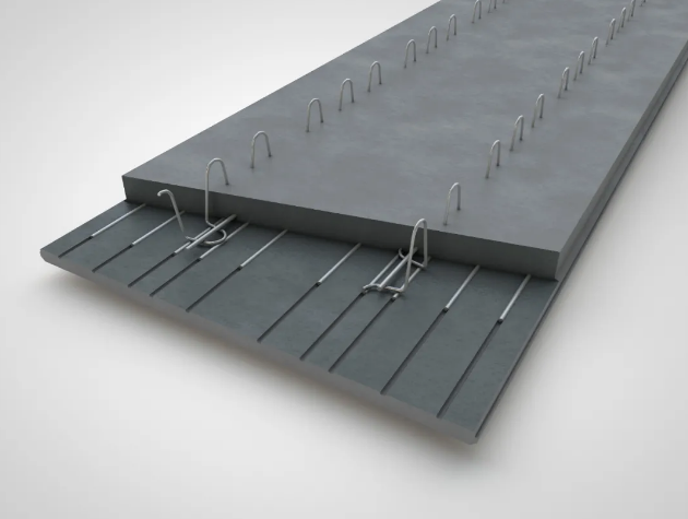 叠合楼板通常是厚度为50-150 mm、宽度为1.2-4 m、跨度为2-8 m的半预制产品。它们非常适合地板上有很多管道和孔洞的建筑物。叠合楼板的浇口高度可以达到100-300 毫米,供现场施工浇筑用。叠合楼板也可以进行预应力作用。