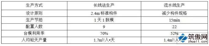 (2)生产2.4m标准构件,长线法生产比流水线生产人工工效提高17%,PC单方成本可降低2.1%。