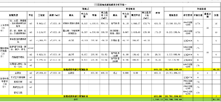 测算思路:主体结构部分尽可能多得分,考虑到河南市场装配式不太成熟的原因,水平梁不再考虑用装配式,板、楼梯、阳台板使用预制构件,水平主体构件装配率可以达到73%,其中板的70.75%使用装配式,得13分;为了保证质量安全,考虑原有的受力的竖向结构还是现浇不变,竖向装配式构件全部靠额外增加来实现,即增加预制外墙延性墙板,此时装配率可以达到44%,得分22分;此时结构部分的预制外墙延性墙板足够多了,可以完全覆盖外墙的竖向构件了,即涵盖了非承重围护墙的非砌筑,也可得5分;内隔墙非砌筑采用ALC板,装配率达到50%,可以得5分,采用全装修可以得6分。