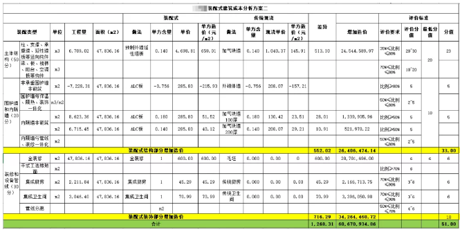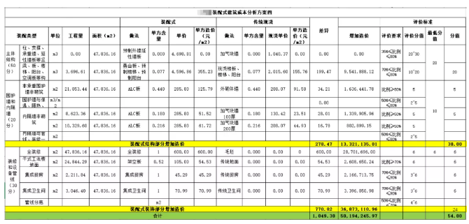 测算思路:在方案一的基础上,把主体结构部分分为竖向构件及水平构件分开测算,本方案水平构件不使用预制构件,竖向构件继续增加使用预制外墙延性墙板,此时装配率调整到48%,得分23分;内隔墙非砌筑采用ALC板,装配率达到50%,可以得5分,采用全装修可以得6分,水平构件减少的分数由装修方面补上,采用集成厨卫,各得6分。