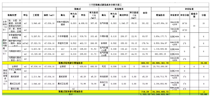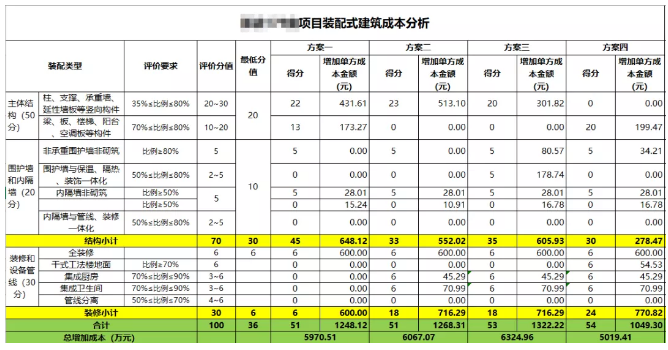 测算思路:在方案二的基础上,竖向构件减少使用预制外墙延性墙板,此时装配率减配至35%,得20分;非承重围护墙非砌筑部分使用预制构件,装配率达到80%,得5分;围护墙与保温、隔热、装饰一体化装配率达到80%,得5分;内隔墙非砌筑采用ALC板,装配率达到50%,可以得5分,采用全装修可以得6分,采用集成厨卫,各得6分。