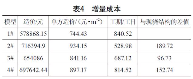 由表3~表5可知,采用预制叠合楼板的2#模型工日缩减效果最为明显,此方案单体预制率为10.52%,增量成本为189.97元/㎡,增量成本值最/大,为现浇结构的1.25倍。3#模型的单体预制率为15.40%,增量成本为96.73元/㎡,单方造价是现浇结构的1.13倍。4#模型的单体预制率为5%,增量成本为152.74元/㎡,为现浇模型的1.21倍。三者的预制率性价比为分别为0.055、0.159、0.033。