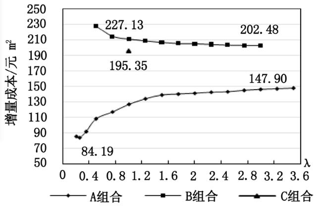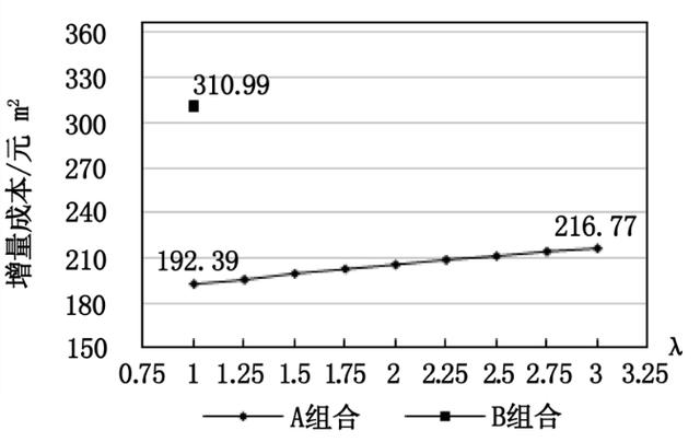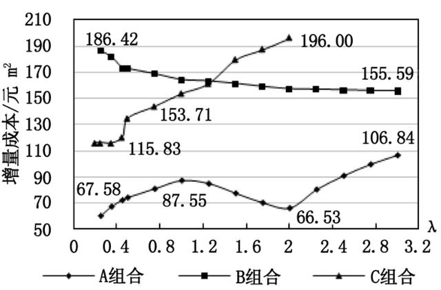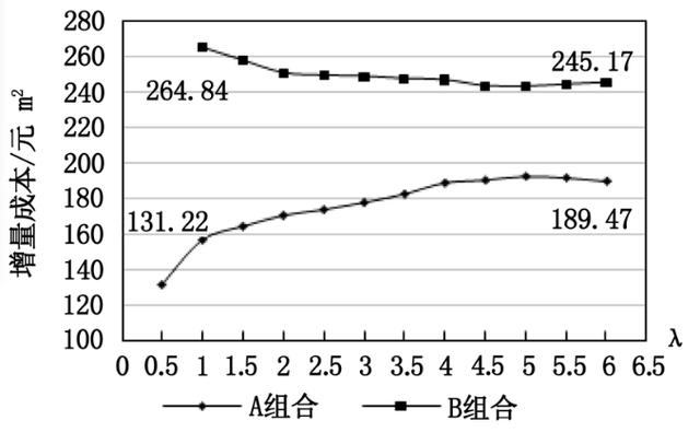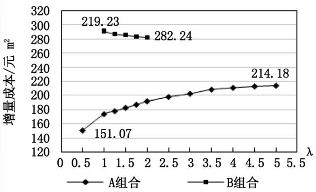 双构件预制组合此刻无法达到大于30%的单体预制率,因此需要考虑三个主体构件采用预制形式的情况。研究方法为先固定其中两种预制构件的预制率,通过控制λ值,计算出最优成本下已选构件的预制构件比例,再通过变化新增预制构件的预制比例来满足整体预制率要求,得到新增预制构件在不同预制率下的增量成本变化图。