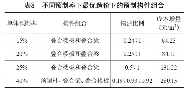 由上述分析可知,通过控制各种预制构件不同组合比例,可以有效的降低装配式建筑的土建成本。以往为了满足建筑的预制率要求,在设计时都是随机搭配预制构件,并没有对由此带来的建筑成本增加进行控制。通过对上文指定预制率下的构件组合进行分析,得到了在不同预制率情况下,装配式框架结构的预制构件最优组合方案,其组合形式如表8。