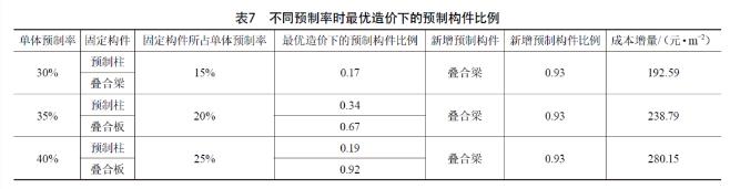 2、 三种单体预制率增量成本的最/低点均出现在新增构件为叠合梁(梁)为0.93时(见表7),增量成本分别为192元/㎡,238.79元/㎡和280.15元/㎡;