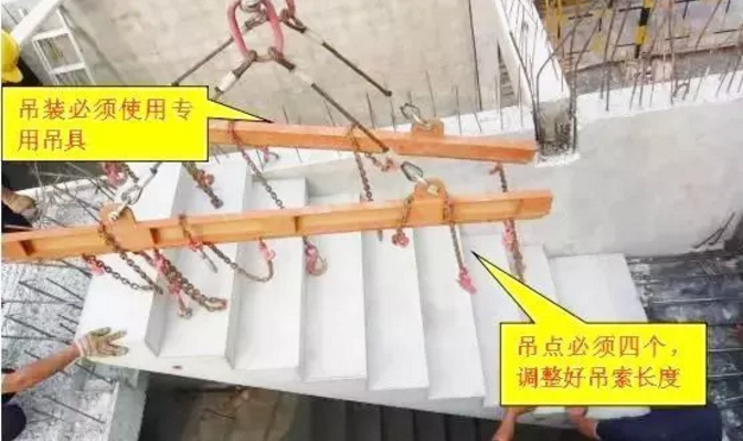 (4)确保在起吊过程中预制梯段休息平台与保持水平状态;采用可调试横吊梁均衡起吊就位,吊点必须在4个或以上。