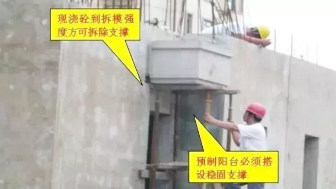 定位放线→构件检查核对→构件起吊→预制阳台吊装就位→校正标高和轴线位置→临时固定→支撑→松钩。
