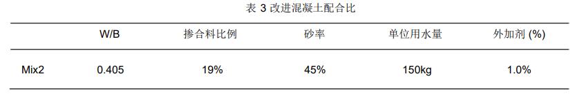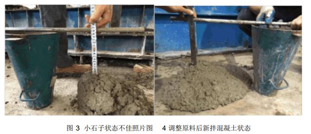 原配合比如表2所示,用于叠合楼板生产,坍落度控制在 100-120mm,在异型构件生产过程中通过料斗下料明显出现困难,入模后振动时间需要适度延长,既容易造成预埋件及保温泡沫块的偏移,也间接增加了施工人员劳动强度和操作时间。