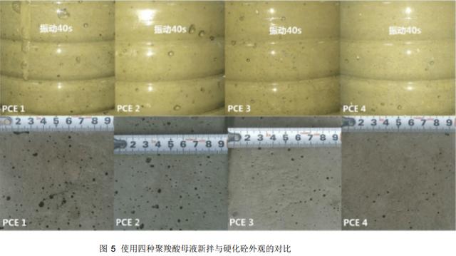 经过试验测定,即使同为早强型聚羧酸母液,不同母液在振动后产生的气泡尺寸、密集度、消泡时间各有不同。确认第 4号聚羧酸母液在新拌混凝土气泡产生量最少、尺寸较小,经试块拆模后验证其外观也为最/佳。