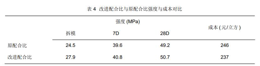 强度对比:由表 4可以看出改进配合比后不仅强度有小幅度提升,成本也有所降低。