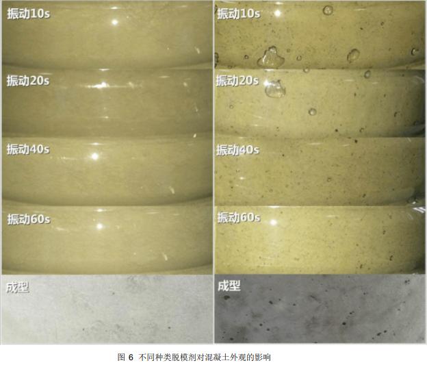 (2) 使用油性脱模剂,易聚集大量气泡,在构件表面形成密集的气孔,严重影响构件外观质量,而使用振动的方式排气,可能会产生浆体分离的泌水现象;而使用水性脱模剂可以显著改善外观,并可以降低振动时间,节约能源。